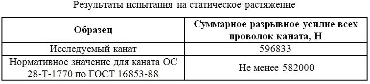 После разрыва всех проволок установлено, что по уровню разрывного усилия всех проволок каната исследуемый канат удовлетворяет требованиям, предъявляемым ГОСТ 16853-88 к канату ОС 28-Т-1770.