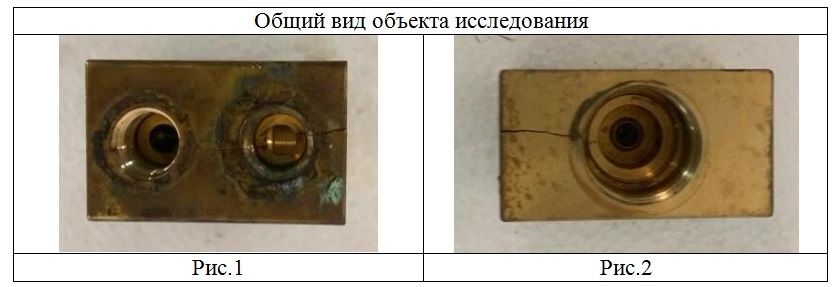 В результате визуального осмотра объекта исследования установлено наличие продольной трещины, проходящей по всем телу клапана. Максимальное раскрытие трещины составляет порядка 1 мм. Следов пластической деформации и механических повреждений на поверхности клапана не обнаружено.