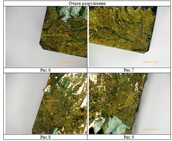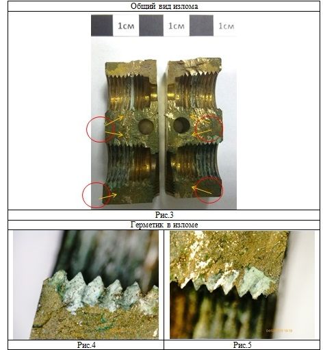 В результате фрактографического изучения поверхностей разрушения клапана установлено, что очаги разрушения (обведены красным, направление распространения роста трещины показано желтыми стрелками) находятся на поверхности грани, в которой высверлены два конических резьбовых отверстия, по сторонам одного из этих отверстий. Наличие смазки-герметика в изломе говорит о том, что разрушение произошло либо сразу после вкручивания в это отверстие конического болта до момента засыхания герметика, либо трещина уже изначально была в резьбовом соединении.